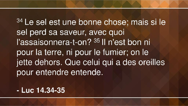 Oui, c’est une bonne chose que le sel. Mais si le sel lui – même perd sa saveur, avec quoi la lui rendra – t – on ? Il n’est bon ni pour la terre, ni pour le fumier ; on le jette dehors.