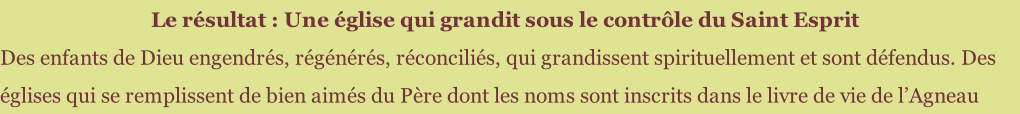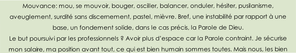 La plupart de ces groupes sont en plus noyés dans deux monstruosités: l’Alliance Mondiale Évangélique ou le Conseil Oecuménique des Églises, voire les deux. Voici donc le fruit du travail des professionnels de la parole gratuite, car, ce fatras, n’est pas du fait des Saints enfants de Dieu, les bien aimés du Père, ça c’est certain.